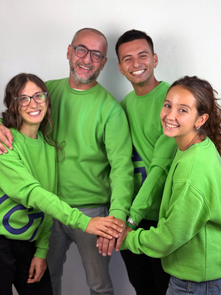 Gaia e Jessica indossano una S, Dario indossa una M, Claudio indossa una L